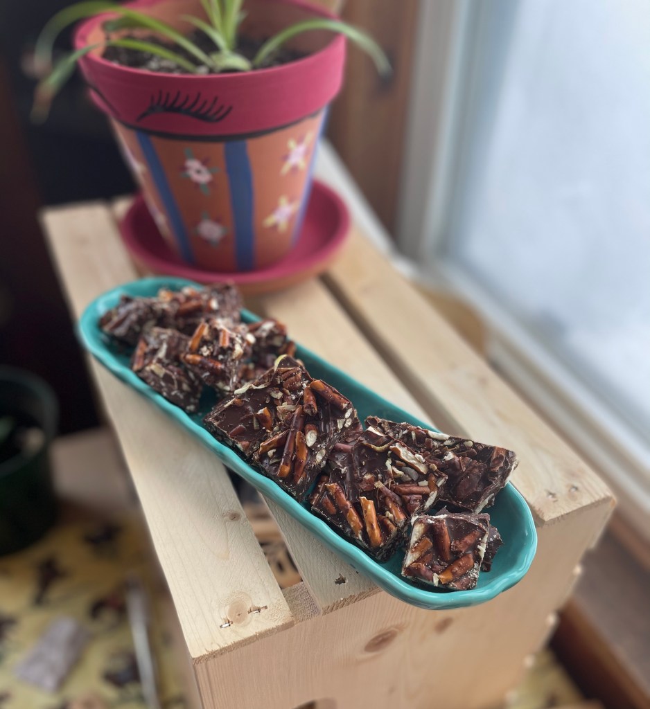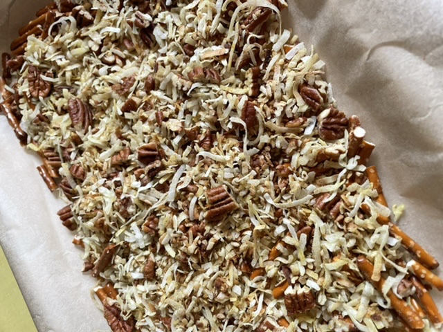 On a sheet pan with sides, place parchment paper so it is going up the sides of the pan. Sprinkle crushed pretzel around. Then add the nuts and coconut mixture. Lastly, pour the melted chocolate over the dry mixture. Spread evenly then refrigerate until hard. This great snack takes about a hour.
