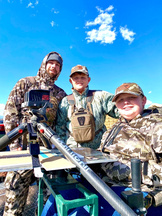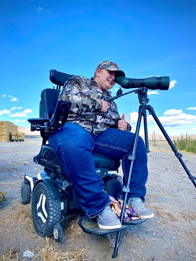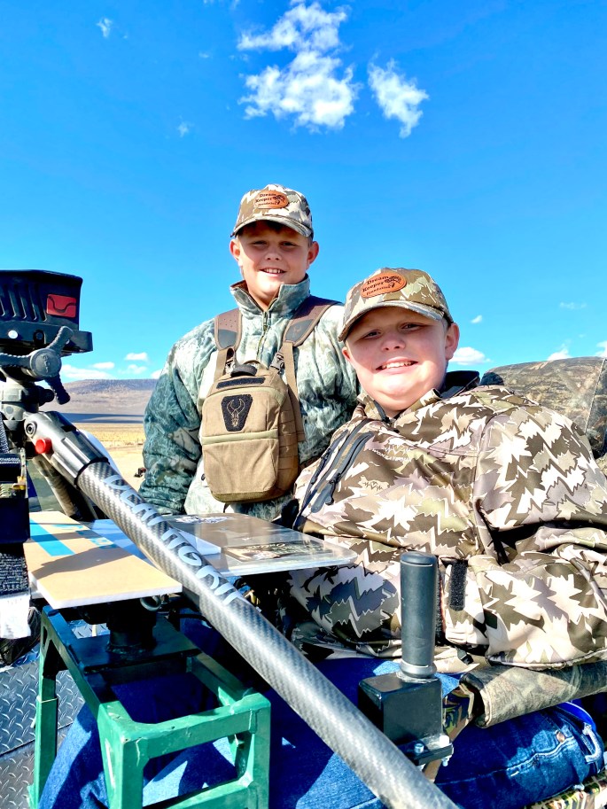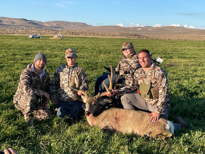 Jim and his crew got lunch out for us and the rest of the guys began glassing for “THE BUCK”. We barely got our sandwiches eaten before they called out that they have found some bucks. Now it was time for Wesley to get into the track chair. He was loaded and now it was time to get the gun mounted on the chair. They got all that done and realize that the scope was not working. You see the scope was supposed to connect to a phone or pad. Which it did the day before. Oops, change of plans. Now they had to move the electronic trigger to a different gun. Thankfully, that worked great. But now Wesley can’t see through the scope. So, the remedy for that was a phone scope. That was going well until they realized that the bolt would not open and they couldn’t load the gun. Now what are we going to do? Jace decided that he would put the cross hairs on the buck and Wesley would shoot the gun. No problem! They practiced before they headed out. It was going to work. Meanwhile, they are keeping an eye on the bucks and more does have shown up from the sage brush. I wish I had better eyes so I can see all these deer out in the sage brush. God’s camouflage, right?