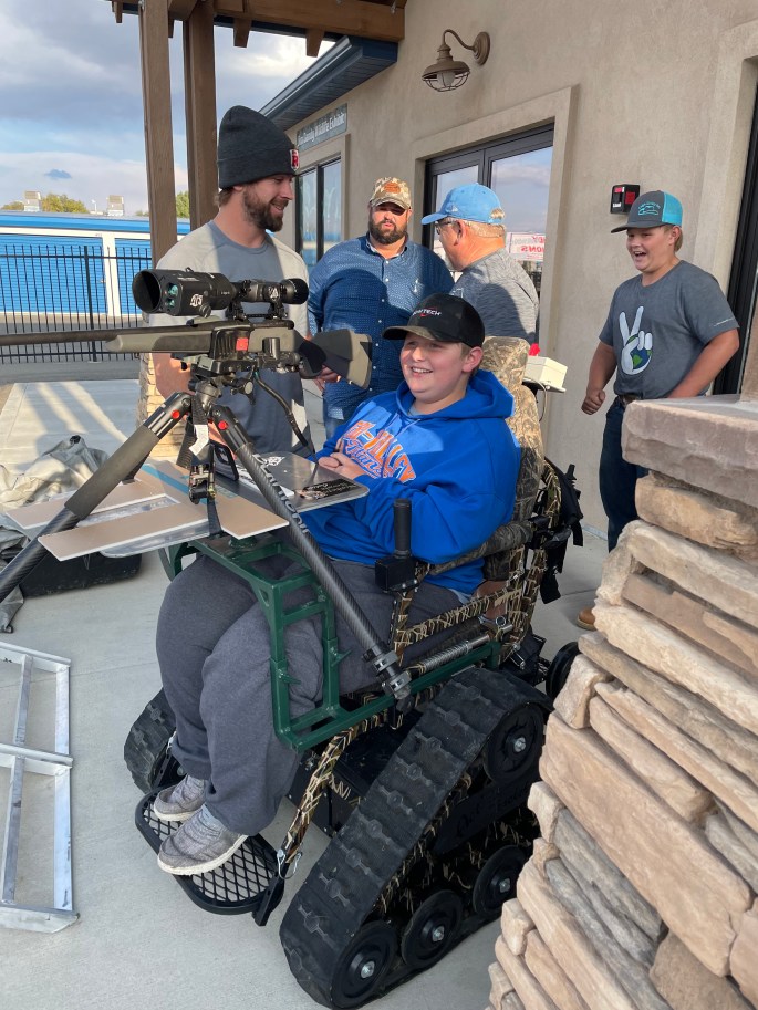The foundation has a track chair for disabled people. With the track chair they have a detachable table and gun holder that goes on it. This helps someone like Wesley who doesn’t have enough muscle tone to hold the gun up. They put Wesley in the track chair and put the table on it. The best part was it had a scope that could blue tooth to a phone or pad. It was an ATN scope. Totally cool for our techy kid! Then the trigger was electronic, and he just had to push a button and the trigger went off. We had it all set up and ready to hunt. He took some practice shots and had high hopes for the upcoming hunt.