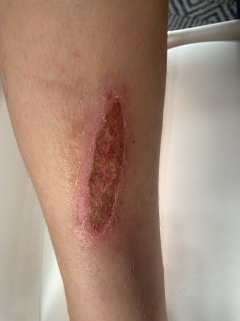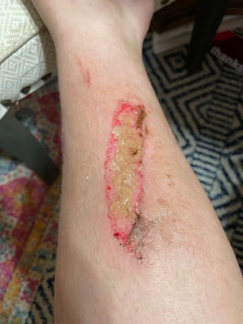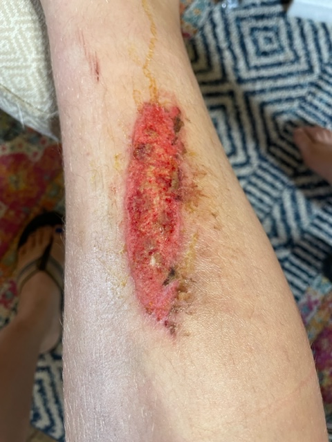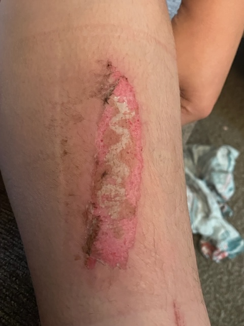 Burns. They hurt, they blister, they ooze, not to mention they can’t get wet. In summertime that causes a problem for a teenage boy. Earlier this summer my 13-year-old, Blake was putting his motorcycle away and went to kick the kick stand down and missed! His shin hit the motor. Before you ask, yes, he was in shorts. He was just taking it back to the barn.