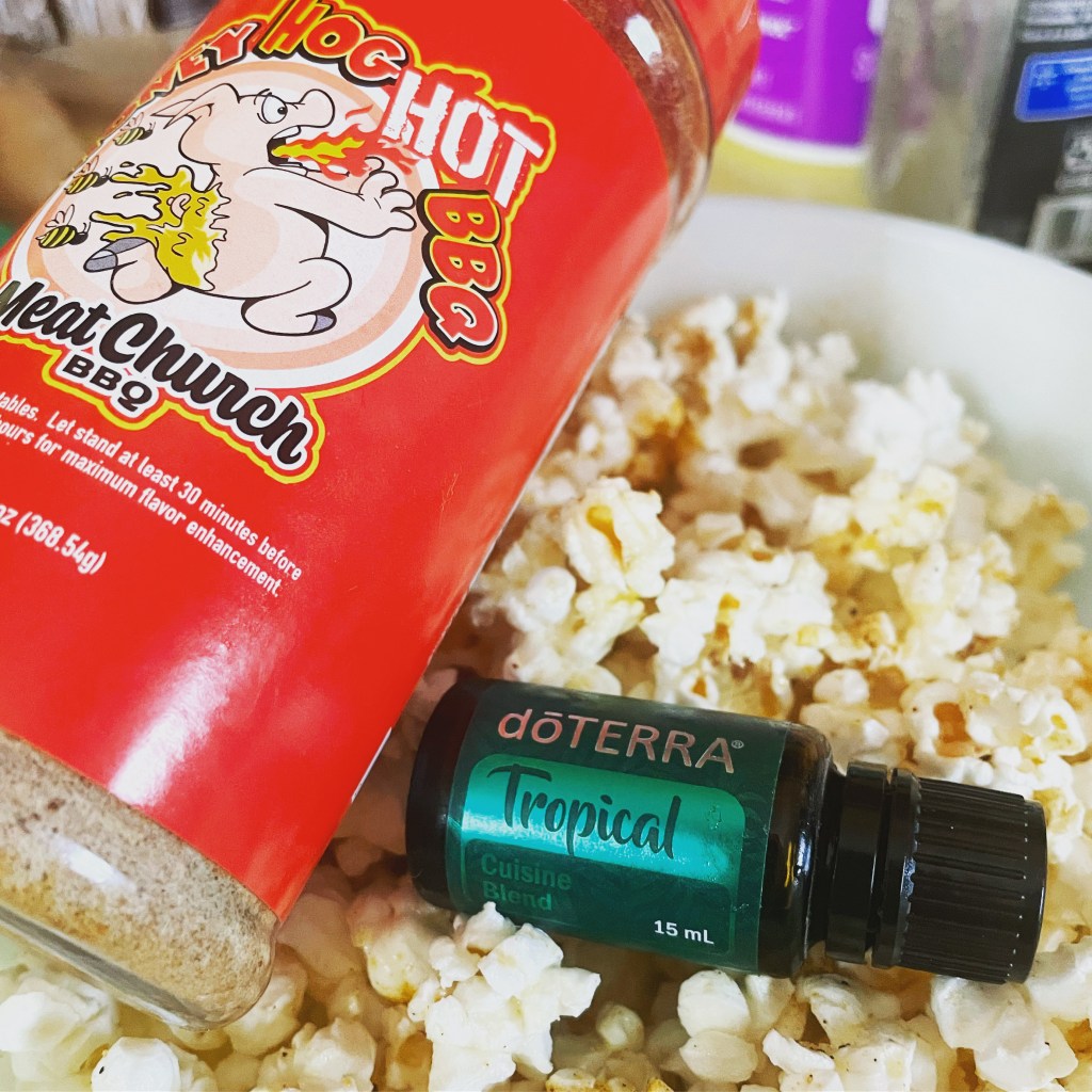 Poor the popped bag of popcorn in a bowl, pour the melted mixture over the top. Then sprinkle on 1 teaspoon of Honey Hot Hog BBQ, from Meat Church. Or your favorite spicy seasoning. Stir and enjoy!!